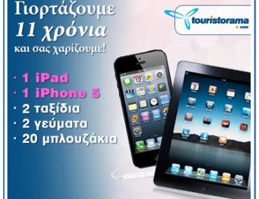 Γιορτάζουμε 11 χρόνια Τουριστόραμα και 8 χρόνια Γάμοι και επιβραβεύουμε την αγάπη και την υποστήριξη που μας δείχνετε όλα αυτά τα χρόνια χαρίζοντας: 1 iPad, 1 iPhone 5, 2 ταξίδια (Καϊμάκτσαλαν και Λίμνη Πλαστήρα) για 2 άτομα και για 3 ημέρες με πρωινό, 2 γεύματα 2 ατόμων απεριόριστης κατανάλωσης στο εστιατόριο “Δύο δεκάρες η οκά” και 20 μπλουζάκια.