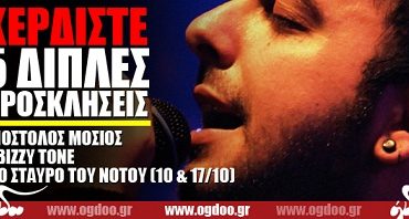 Το Ogdoo.gr εξασφάλισε για τους αναγνώστες του πέντε διπλές προσκλήσεις με κρασί ή μπύρα ανά συναυλία του Απόστολου Μόσιου & των Bizzy Tone στο Σταυρό του Νότου Club, στις 10 & 17 Οκτωβρίου 2012.