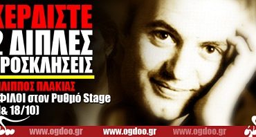 Το Ogdoo.gr εξασφάλισε για τους αναγνώστες του από δύο διπλές προσκλήσεις με κρασί ή μπύρα για τις εμφανίσεις του Φίλιππου Πλακιά με τη συμμετοχή των Διονύση Τσακνή, Γεράσιμου Ανδρεάτου & Σοφίας Παπάζογλου στο Ρυθμός Stage, στις 11 & 18 Οκτωβρίου 2012.