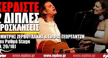 Το Ogdoo.gr εξασφάλισε για τους αναγνώστες του δύο διπλές προσκλήσεις με ποτό ή κρασί για τις δύο πρώτες εμφανίσεις του Δημήτρη Ζερβουδάκη με τη Σοφία Γεωργαντζή στο Ρυθμός Stage, στις 19 & 20 Οκτωβρίου 2012.