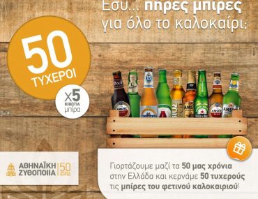 Η Αθηναϊκή Ζυθοποιία διοργανώνει διαγωνισμό και δίνει τη δυνατότητα σε 50 τυχερούς να κερδίσουν από 5 κιβώτια μπύρα της επιλογής τους. Συγκεκριμένα, κάθε νικητής θα κερδίσει από 5 κιβώτια Amstel Bock ή Amstel Pilsener ή Fisher ή Buckler ή Amstel ή Heineken ή Amstel Radler ή ΒΙΟΣ 5 ή ΑΛΦΑ.