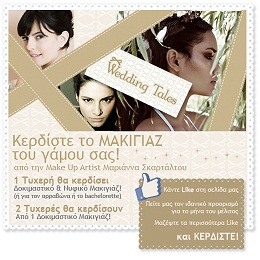 Η σελίδα WeddingTales.gr διοργανώνει διαγωνισμό και σας καλεί να κάνετε post το ιδανικό μέρος για μήνα του μέλιτος, να συγκεντρώσετε τα περισσότερα Like και η νικήτρια με τα περρισσότερα Like θα κερδίσει ένα δοκιμαστικό και ένα νυφικό μακιγιάζ, ενώ η δεύτερη και η τρίτη με τα περισσότερα Like θα κερδίσουν από ένα δοκιμαστικό μακιγιάζ.