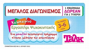 Το Τaλκ και η διεπιστημονική ομάδα βιωματικών εκπαιδευτικών προγραμμάτων «E.Q. with I.Q.» διοργανώνουν με αφορμή την έναρξη του σχολικού έτους μεγάλο διαγωνισμό και προσφέρουν σε οκτώ τυχερούς από μια συμμετοχή δύο εβδομάδων για το παιδί τους, σε μια από τις ομάδες της αρεσκείας τους που θα υλοποιηθούν το ακαδημαϊκό έτος 2012-2013.