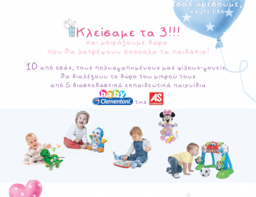 Το babyzone.gr διοργανώνει διαγωνισμό και σας δίνει τη δυνατότητα να κερδίσετε 10 παιχνίδια AS ! Επιλέξτε ανάμεσα στα: Μαμά Πιγκουίνα και ο Μικρός Πικού, το πρώτο Tablet Mickey και Minnie, Minnie Η Πρώτη μου Κούκλα, Γκολάκιας και Δεινόσαυρος Ντοντό.