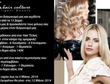 Το dkhairculture.com διοργανώνει διαγωνισμό και δίνει τη δυνατότητα σε 3 άτομα να κερδίσουν από ένα Hair Ticket & σε 10 άτομα να κερδίσουν από ένα πακέτο περιποίησης!