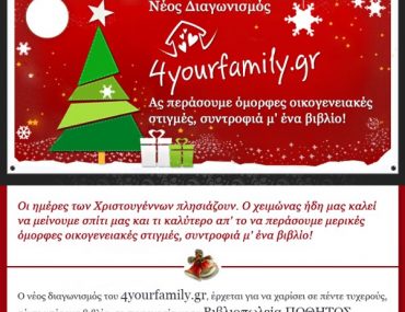 Οι ημέρες των Χριστουγέννων πλησιάζουν. Ο χειμώνας ήδη μας καλεί να μείνουμε σπίτι μας και τι καλύτερο απ’ το να περάσουμε μερικές όμορφες οικογενειακές στιγμές, συντροφιά μ’ ένα βιβλίο! Ο νέος διαγωνισμός του 4yourfamily.gr, έρχεται για να χαρίσει σε πέντε τυχερούς, πέντε υπέροχα βιβλία, σε συνεργασία με τα Βιβλιοπωλεία ΠΟΘΗΤΟΣ.
