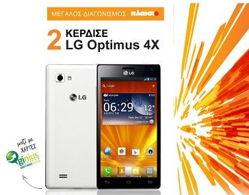 To ΠΛΑΙΣΙΟ διοργανώνει διαγωνισμό και δίνει τη δυνατότητα σε 2 τυχερούς να κερδίσουν ένα μαύρο LG Optimus 4X HD μαζί με χάρτες Ginius Driver-Don’t Panic ο πρώτος νικητής και ένα λευκό LG Optimus 4X HD μαζί με χάρτες Ginius Driver-Don’t Panic ο δεύτερος νικητής.