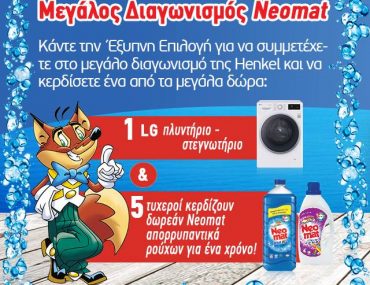 H Henkel Hellas διοργανώνει διαγωνισμό και δίνει τη δυνατότητα σε 200 τυχερούς να κερδίσουν συσκευασίες Neomat και σε ένα μεγάλο τυχερό ένα πλυντήριο LG F8068QD!