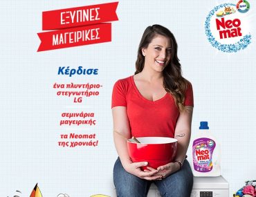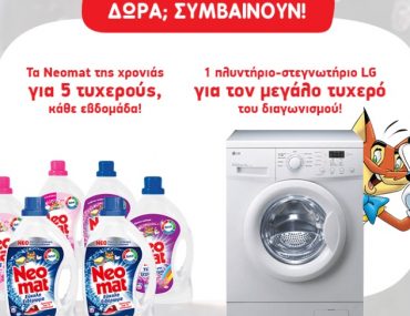 To Neomat διοργανώνει διαγωνισμό και δίνει τη δυνατότητα σε 5 τυχερούς κάθε εβδομάδα να κερδίσουν τα απορρυπαντικά της χρονιάς και σε ένα μεγάλο τυχερό ένα πλυντήριο-στεγνωτήριο LG!