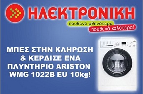 Η Ηλεκτρονική διοργανώνει διαγωνισμό και σας δίνει τη δυνατότητα να κερδίσετε ένα πλυντήριο ARISTON WMG 1022B EU χωρητικότητας 10 κιλών, με 16 προγράμματα πλύσης, ενεργειακής κλάσης Α++.