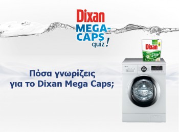 Το Dixan, το πρώτο απορρυπαντικό πλυντηρίου που εμφανίστηκε στην ελληνική αγορά, εγκαινιάζει τη σελίδα του στο facebook με ένα Mega-λο διαγωνισμό με πρωταγωνιστές τα Mega caps! Από σήμερα και κάθε μέρα μπαίνοντας στη σελίδα του Dixan στο facebook, απαντάς σωστά στo quiz των Mega Caps και αυτόματα μπαίνεις στην κλήρωση της ημέρας για 1 από τις 5 συσκευασίες Dixan Mega Caps Φρεσκάδα Άνοιξης 32Μ. Στο τέλος του διαγωνισμού και για όσες σωστές απαντήσεις έχεις, τόσες θα είναι και οι συμμετοχές σου για τη μεγάλη κλήρωση ενός πλυντηρίου LG!