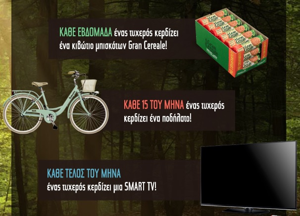 Η Grancereale Greece διοργανώνει διαγωνισμό και σας δίνει τη δυνατότητα να κερδίσετε κάθε εβδομάδα ένα κιβώτιο μπισκότων Gran Cereale, κάθε 15 του μήνα ένα ποδήλατο και κάθε τέλος του μήνα μία τηλεόραση SMART TV Samsung TV 32”!