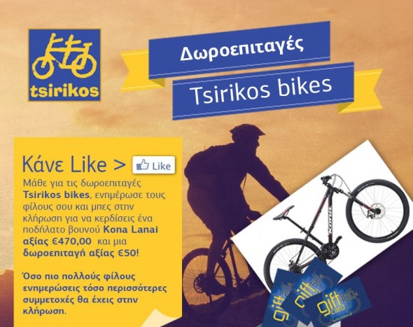 Τα Tsirikos bikes διοργανώνουν διαγωνισμό και σας δίνουν τη δυνατότητα να κερδίσετε ένα ποδήλατο βουνού Kona Lanai και μια δωροεπιταγή αξίας 50 ευρώ.