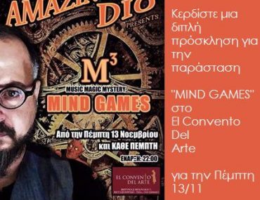 Το www.Streetmagic.gr δίνει την ευκαιρία σε ένα μέλος του να κερδίσει μια διπλή πρόσκληση για να παρακολουθήσει την μαγική παράσταση “MIND GAMES” στο El Convento Del Arte.