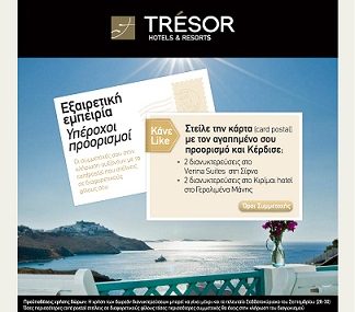 Η σελίδα Tresor Hotels and Resorts διοργανώνει διαγωνισμό και σας δίνει τη δυνατότητα να κερδίσετε 2 διανυκτερεύσεις στοVerina Suites στη Σίφνο και 2 διανυκτερεύσεις στο Κιριμαι Hotel στο Γερολιμένα Μάνης.