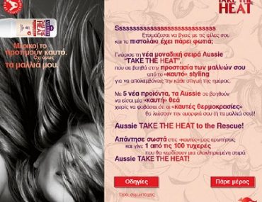 Η σελίδα Aussie Greece διοργανώνει διαγωνισμό και σας δίνει τη δυνατότητα να κερδίσετε 100 ολοκληρωμένες σειρές περιποίησης “Take the Heat” που περιλαμβάνουν: Ένα Σαμπουάν Take the Heat, ένα Conditioner Take the Heat, μία εντατική μάσκα 3 Minute Miracle Take the Heat, ένα Leave in Spray Take the Heat και μία κρέμα περιποίησης Take the Heat.