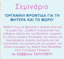 Η Neal’s Yard Remedies διοργανώνει διαγωνισμό και σας δίνει τη δυνατότητα να κερδίσετε 2 συμμετοχές για το σεμινάριο “Οργανική Φροντίδα για τη Μητέρα και το Μωρό”, στον πολυχώρο Parapera, το Σάββατο 12/11, 1.30-4.30 μ.μ.
