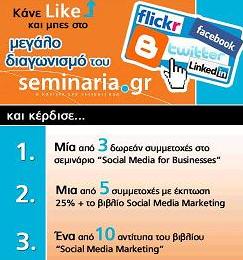 Το seminaria.gr διοργανώνει διαγωνισμό και σας δίνει τη δυνατότητα να κερδίσετε 3 συμμετοχές στο σεμινάριο “Social Media Businesses” και 15 αντίτυπα του βιβλίο Social Media Marketing.