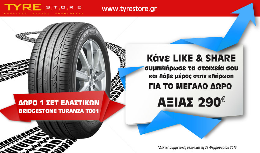 Το TYRE STORE διοργανώνει διαγωνισμό και σας δίνει τη δυνατότητα να κερδίσετε ένα σετ 4 ελαστικά Bridgestone Turanza T001 αξίας 290€!