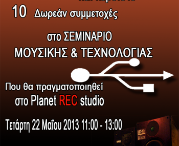 Η εταιρία Καλλιτεχνήματα διοργανώνει διαγωνισμό και σας δίνει τη δυνατότητα να κερδίσετε 10 δωρεάν συμμετοχές στο σεμινάριο Μουσικής & Τεχνολογίας που θα πραγματοποιηθεί στο Planet REC studio.