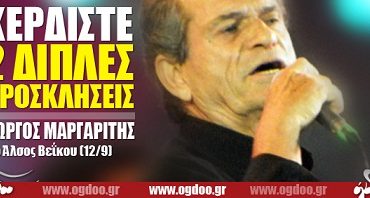 Το Ogdoo.gr εξασφάλισε για τους αναγνώστες του δύο διπλές προσκλήσεις για τη μεγάλη συναυλία του Γιώργου Μαργαρίτη στο Άλσος Βεΐκου, στις 12 Σεπτεμβρίου 2012.