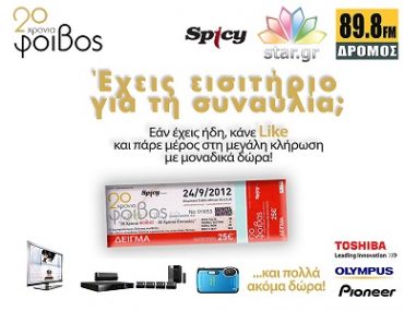 Η Spicy και ο Γερμανός διοργανώνουν διαγωνισμό και σας δίνουν τη δυνατότητα να κερδίσετε 50 διπλά εισιτήρια για τη συναυλία για τα 20 χρόνια του Φοίβου στο ΟΑΚΑ στις 24 Σεπτεμβρίου και 1000 ακόμα δώρα από το Γερμανό, tablet SAMSUNG GALAXY TAB II, smartphones SAMSUNG GALAXY ACE 2, προπληρωμένες κάρτες (prepaid cards), usb sticks 4GB, mouse υπολογιστή, σετ Web communication, mouse pads και εξωτερικούς σκληρούς 500Gb.