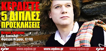 Το Ogdoo.gr εξασφάλισε για τους αναγνώστες του πέντε διπλές προσκλήσεις για τη συναυλία του Πέτρου Γαϊτάνου στο Φράγμα Θέρμης, την Τετάρτη 12 Σεπτεμβρίου 2012.