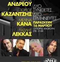 Ο Γιώργος Ανδρέου και ο Γιώργος Καζαντζής παρουσιάζουν ένα κύκλο από γνωστά τραγούδια τους, επιτυχίες με τις εξαίσιες φωνές της Μελίνας Κανά, του Βασίλη Λέκκα και με την μαγική συνοδεία των πιάνων τους. Το CITY σας προσφέρει 10 διπλά free pass (δωρεάν είσοδος, χωρίς ποτό) για την συναυλία Δύο Συνθέτες-Δύο Ερμηνευτές, για την Παρασκευή 16 Μαρτίου στις 21:00 στο Μύλος Club.
