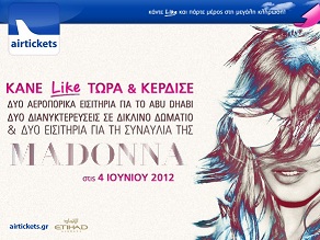 Η airtickets.gr διοργανώνει διαγωνισμό και σας δίνει τη δυνατότητα να κερδίσετε 2 αεροπορικά εισιτήρια με την Etihad Airways σε οικονομικό ναύλο για το Άμπου Ντάμπι, 2 διανυκτερεύσεις σε δίκλινο δωμάτιο και δύο 2 εισιτήρια για τη συναυλία της Madonna στις 4 Ιουνίου 2012.