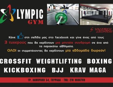 Το olympicgym.gr διοργανώνει διαγωνισμό και δίνει τη δυνατότητα σε 3 τυχερούς να κερδίσουν από μία μηνιαία συνδρομή αξίας 60 ευρώ σε ένα από τα παρακάτω αθλήματα: crossfit, weightlifting, boxing, kickboxing, BJJ, Krav Maga.
