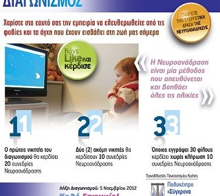 Tα Σύγχρονα Αμφιαράεια διοργανώνουν διαγωνισμό και σας δίνουν τη δυνατότητα να κερδίσετε: 1ο δώρο: 20 συνεδρίες Νευροανάδρασης, 2ο δώρο: για 2 νικητές από 10 συνεδρίες αυτοανάδρασης και 3ο δώρο για όποιον γράψει 30 φίλους χωρίς κλήρωση 10 συνεδρίες αυτοανάδρασης.