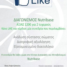 Το Κέντρο Διατροφής και Μεταβολισμού NUTRIBAS διοργανώνει διαγωνισμό και δίνει η δυνατότητα σε 2 τυχερούς να κερδίσουν από μια συνεδρία, συνολικής αξίας 120 ευρώ, που περιλαμβάνει: Ανάλυση σύστασης σώματος, διατροφική αξιολόγηση και εξατομικευμένο διαιτολόγιο.