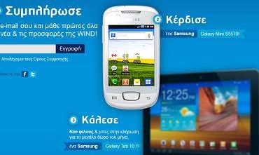 Η WIND διοργανώνει διαγωνισμό και δίνει τη δυνατότητα σε 4 τυχερούς να κερδίσουν από μια συσκευή Samsung Galaxy Mini S5570 και σε ένα μεγάλο τυχερό ένα Samsung Galaxy Tablet 10.1.