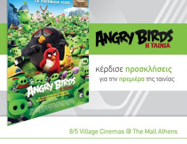 Η VILLAGE διοργανώνει διαγωνισμό και σας δίνει τη δυνατότητα να κερδίσετε 80 διπλές προσκλήσεις για την πρεμιέρα της ταινίας “Angry Birds – H ταινία” που θα λάβει χώρα στις 08/05/2016 στα Village Cinemas στο The Mall Athens (Μαρούσι), στις 16:00.