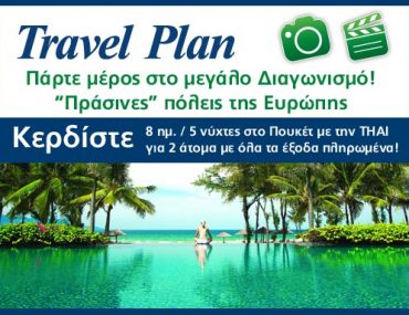Το Travel Plan ο μεγαλύτερος ταξιδιωτικός οργανισμός στην Ελλάδα, ανακοινώνει τον μεγάλο διαγωνισμό με θέμα Πράσινες Πόλεις της Ευρώπης. Πρόκειται για έναν διαγωνισμό μέσω facebook όπου η καλύτερη φωτογραφία ή video θα κερδίσει ένα ταξίδι δύο ατόμων στο Πουκέτ.