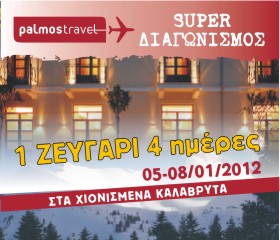 Η Εταιρία Palmos Travel διοργανώνει διαγωνισμό και σας δίνει τη δυνατότητα να κερδίσετε ένα ταξίδι στα χιονισμένα Καλάβρυτα 3 διανυκτερεύσεων με πρωινό σε 4* ξενοδοχείο.