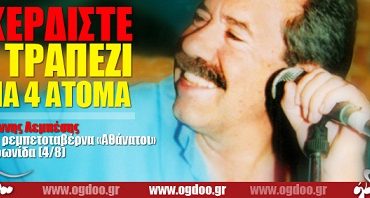 Το Ogdoo.gr εξασφάλισε για έναν τυχερό αναγνώστη και την παρέα του, ένα τραπέζι με πλήρες μενού και κρασί για τέσσερα άτομα, στη ρεμπετοταβέρνα «Αθάνατοι» (Λεωφ. Σαρωνίδας 69) όπου θα εμφανιστεί ο Γιάννης Λεμπέσης και η ορχήστρα του «Λαϊκή Στράτα», το Σάββατο 4 Αυγούστου 2012.