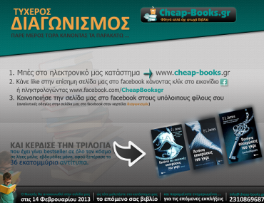 Το cheap-books.gr διοργανώνει διαγωνισμό και σας δίνει τη δυνατότητα να κερδίσετε την τριλογία “50 Αποχρώσεις του γκρι” που έχει γίνει bestseller σε όλο τον κόσμο σε λίγες μόλις εβδομάδες μόνο, αφού ξεπέρασε τα 36 εκατομμύρια αντίτυπα.