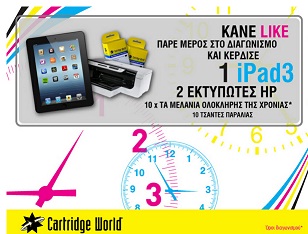 Το Cartridge World Greece διοργανώνει διαγωνισμό και δίνει τη δυνατότητα σε ένα τυχερό να κερδίσει ένα ipad3, σε 2 τυχερούς να κερδίσουν από έναν εκτυπωτή HP Officejet 6000, σε 10 τυχερούς να κερδίσουν ξαναγέμισμα για inkjet μελάνια μιας ολόκληρης χρονιάς και σε 10 ακόμα, τσάντες παραλίας Cartridge World.