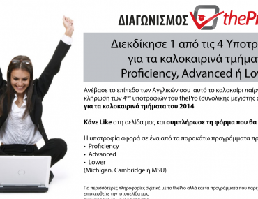 Το thepro.gr διοργανώνει διαγωνισμό και σας δίνει τη δυνατότητα να κερδίσετε 4 υποτροφίες για καλοκαιρινά μαθήματα Αγγλικών συνολικής μέγιστης αξίας 2.400€!