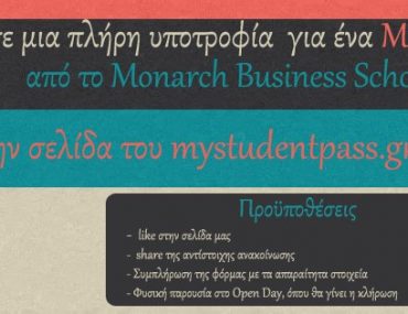 Το mystudentpass.gr ξεκινάει τη φοιτητική σεζόν με δώρα και προσφέρει σε έναν φοιτητή μια πλήρη υποτροφία για ένα MBA Executive του Monarch Business School αξίας 5.400 ευρώ.