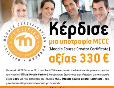 Η σελίδα WIDE Services διοργανώνει διαγωνισμό και σας δίνει τη δυνατότητα να κερδίσετε 1 υποτροφία MCCC (Moodle Course Creator Certificate), του μοναδικού επίσημου πιστοποιητικού για το Moodle, αξίας 330€!