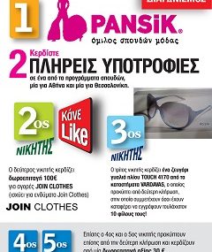 Η PANSIK διοργανώνει διαγωνισμό και σας δίνει τη δυνατότητα στους 2 πρώτους νικητές να κερδίσουν από 1 ΠΛΗΡΗ ΥΠΟΤΡΟΦΙΑ σε ένα από τα προγράμματα σπουδών μία στην Αθήνα και μία στην Θεσσαλονίκη. Ο 2ος νικητής κερδίζει μια δωροεπιταγή 100€ για αγορές JOIN CLOTHES. Ακόμα, ο 3ος νικητής, ο οποίος προκύπτει από την δεύτερη κλήρωση στην οποία συμμετέχουν όσοι έχουν καταφέρει να εγγράψουν τουλάχιστον 10 φίλους τους, κερδίζει ένα ζευγάρι γυαλιά ηλίου TOUCH 4170 από τα καταστήματα VARDAVAS. Επίσης ο 4ος και 5ος νικητής προκύπτουν επίσης από την δεύτερη κλήρωση και κερδίζουν από μία δωροεπιταγή 30 € από τα καταστήματα οπτικών VARDAVAS.