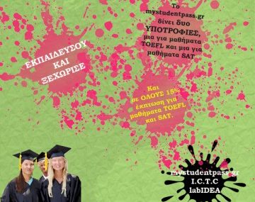 Το mystudentpass.gr αναγνωρίζοντας την αξία των πιστοποιήσεων και την χρηστικότητά τους, δίνει δυο υποτροφίες, μια για μαθήματα TOEFL και μια για μαθήματα SAT. Επιπλέον εξασφάλισε για τους αναγνώστες του, έκπτωση για μαθήματα TOEFL και SAT.