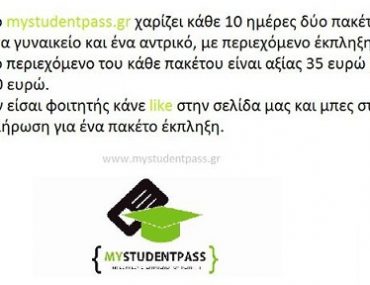 Το mystudentpass.gr χαρίζει κάθε 10 ημέρες δύο πακέτα, ένα αντρικό και ένα γυναικείο, με περιεχόμενο έκπληξη. Αν είστε φοιτητής κάντε like στην σελίδα και μπείτε στην κλήρωση για ένα πακέτο.