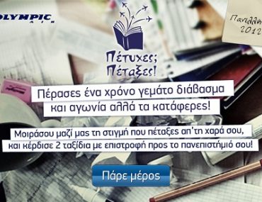 Η Olympic Air διοργανώνει το διαγωνισμό «Πέτυχες; Πέταξες!» και δίνει τη δυνατότητα σε 10 τυχερούς να κερδίσουν από 2 αεροπορικά εισιτήρια (συμπεριλαμβανομένων των φόρων αεροδρομίου) με την Olympic Air προς επιλεγμένο προορισμό, μετ’ επιστροφής.