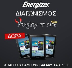 Το Energizer διοργανώνει το διαγωνισμό Naughty or Nice και σας δίνει τη δυνατότητα να κερδίσετε 3 Samsung Galaxy Tab 7.0 II και 30 σετ προϊόντων Energizer.