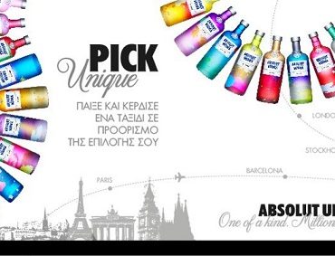 Η Absolut Vodka Greece διοργανώνει το διαγωνισμό Pick Unique και σας καλεί να διαλέξετε την αγαπημένη σας φιάλη και να κερδίσετε ένα ταξίδι που θα επιλέξετε ανάμεσα σε Βαρκελώνη, Λονδίνο, Στοκχόλμη, Βερολίνο και Παρίσι. Επιπλέον 35 τυχεροί θα κερδίσουν τη φιάλη Absolute Unique που επέλεξαν.