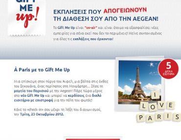Η Aegean Airlines διοργανώνει το διαγωνισμό «GIFT ME UP» και σας δίνει τη δυνατότητα να κερδίσετε 5 αεροπορικά εισιτήρια μετ΄ επιστροφής, για δύο άτομα για τo Παρίσι.