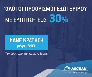 Επωφεληθείτε από την παρακάτω προσφορά της Aegean Airlines και κάνε έξυπνες και φθηνές αγορές. Όλοι οι προορισμοί εξωτερικού με έκπτωση έως 30%!